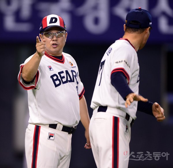18일 서울 잠실야구장에서 ‘2019 신한은행 MY CAR KBO리그’ 롯데 자이언츠와 두산 베어스의 경기가 열렸다. 두산 김태형 감독이 9회초 수비를 앞두고 선수들의 수비 위치를 파악하고 있다.