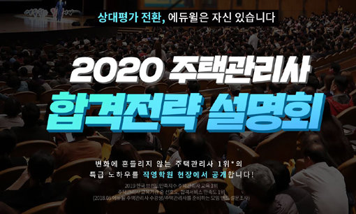 에듀윌 주택관리사 전국 직영학원은 오는 25일 오후 1시에 합격전략 설명회를 개최한다. 설명회는 주택관리사 서울 대방학원을 비롯해 서울 노원학원, 인천 부평학원, 대전학원, 부산 서면학원에서 진행되는데, 2020년 시험 출제 경향과 과목별 학습 전략과 에듀윌만의 특급 전략 등을 제시할 방침이다. 교수님 간담회, 1대1 맞춤 상담 등도 마련됐다.
