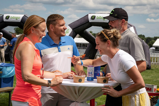 CJ그룹이 더 CJ컵을 발판 삼아 PGA투어를 통해 미국 전역에서 비비고 알리기에 나섰다. PGA투어 대회장을 찾은 갤러리들이 비비고 음식을 맛보며 즐거워하고 있다. 사진제공|CJ그룹
