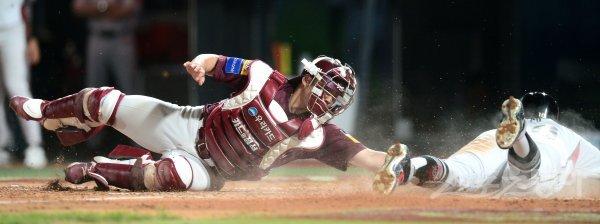 20일 수원KT위즈파크에서 ‘2019 신한은행 MY CAR KBO리그’ 키움 히어로즈와 KT 위즈 경기가 열렸다. 8회말 1사 1,3루 KT 김민혁 외아플라이 때 3루주자 황재균이 태그업 시도해 홈에서 아웃되고 있다.