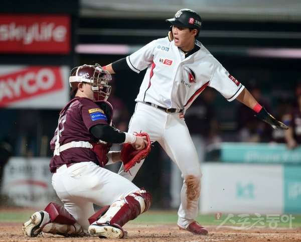 21일 수원KT위즈파크에서 ‘2019 신한은행 MY CAR KBO리그’ 키움 히어로즈와 KT 위즈 경기가 열렸다. 5회말 무사 KT 내야 땅볼 때 3루주자 박승욱이 홈으로 달려 세이프 되고 있다.