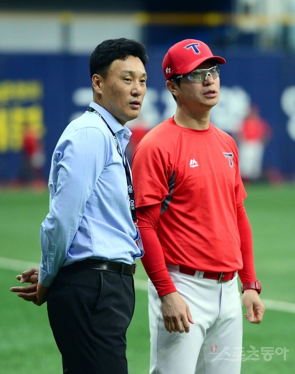 22일 서울 고척 스카이돔에서 ‘2019 신한은행 MY CAR KBO리그’ 키움 히어로즈와 KIA 타이거즈의 경기가 열린다. 경기전 이승엽 해설위원과 KIA 김종국 코치가 이야기를 나누고 있다.