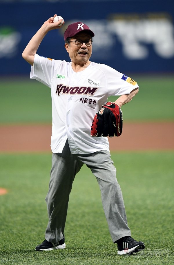 22일 서울 고척 스카이돔에서 ‘2019 신한은행 MY CAR KBO리그’ 키움 히어로즈와 KIA 타이거즈의 경기가 열렸다. 방송인 신구가 시구를 던지고 있다.