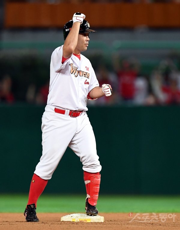 24일 인천 SK행복드림구장에서 ‘2019 신한은행 MY CAR KBO리그’ SK 와이번스와 KIA 타이거즈의 경기가 열렸다. 8회말 2사 3루에서 SK 대타 이재원이 1타점 2루타를 날린 뒤 환호하고 있다.