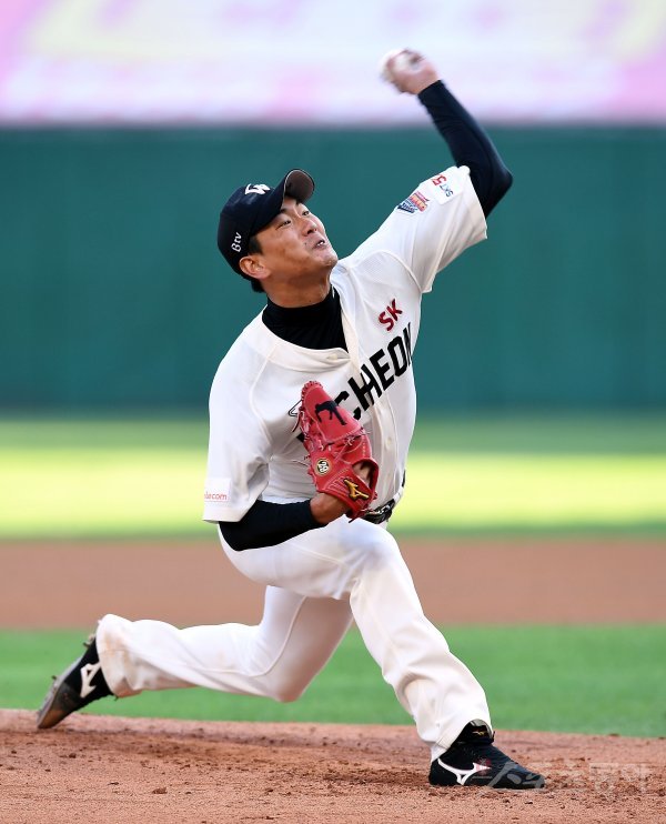 SK 선발투수 김광현이 힘차게 볼을 던지고 있다.