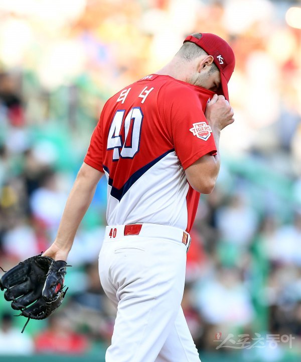 4회말 1사 2루에서 SK 고종욱에게 동점타를 허용한 KIA 선발 터너가 아쉬워하고 있다.