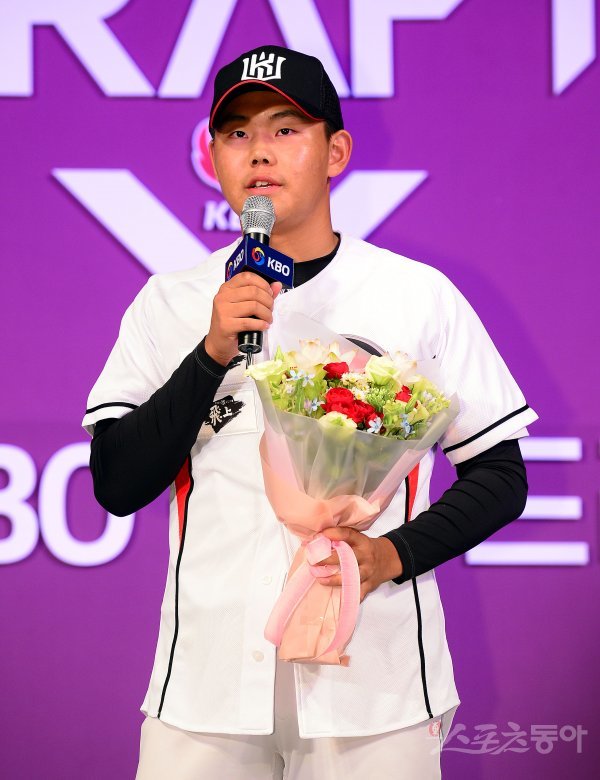 kt에 1차 지명된 유신고 소형준이 유니폼을 입고 소감을 밝히고 있다.