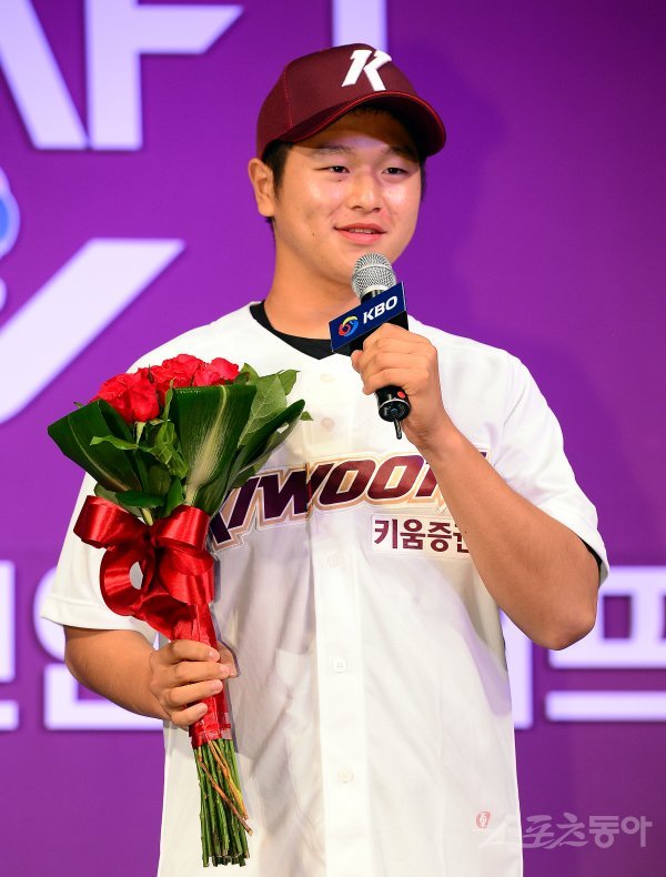 키움에 1차 지명된 장충고 박주홍이 유니폼을 입고 소감을 밝히고 있다.