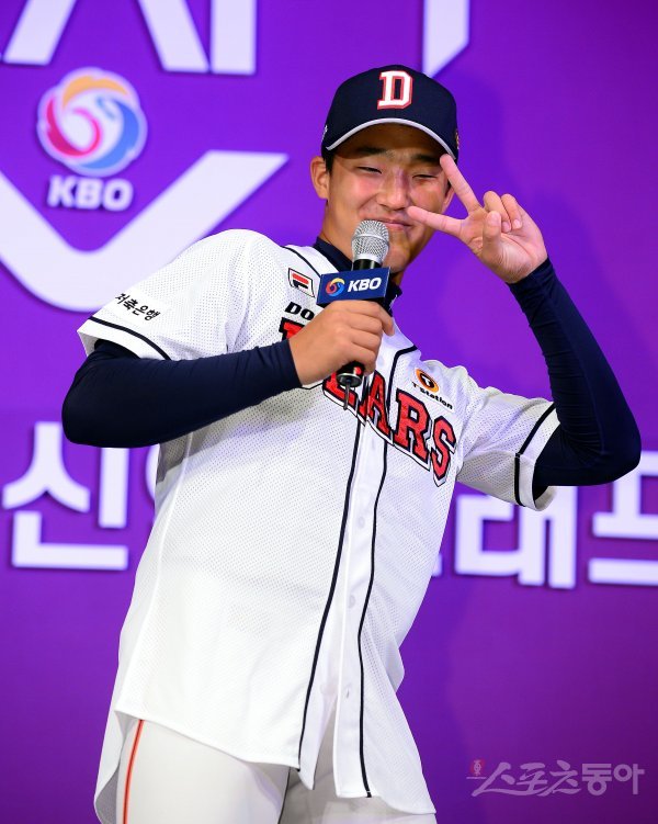 두산에 1차 지명된 성남고 이주엽이 유니폼을 입고 포즈를 취하고 있다.