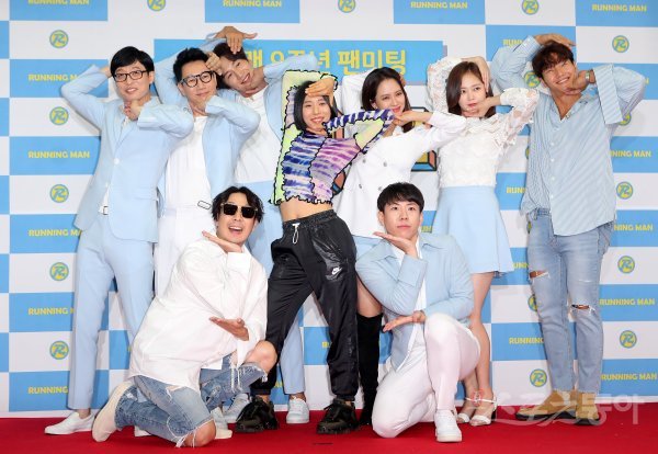 26일 서울 서대문구 이화여대 대강당에서 열린 SBS 예능 ‘런닝맨’ 9주년 기념 팬미팅 ‘런닝구’ 포토행사에 출연진들과 안무가 리아킴(가운데)이 참석해 포즈를 취하고 있다.