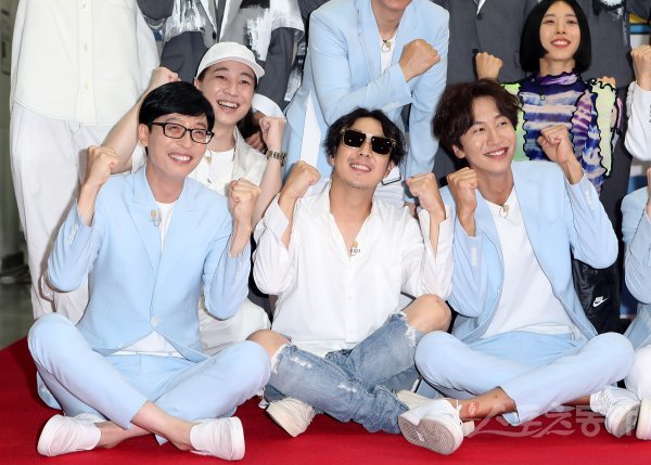개그맨 유재석과 가수 겸 방송인 하하, 배우 이광수(왼쪽부터)가 26일 서울 서대문구 이화여대 대강당에서 열린 SBS 예능 ‘런닝맨’ 9주년 기념 팬미팅 ‘런닝구’ 포토행사에 참석해 포즈를 취하고 있다.
