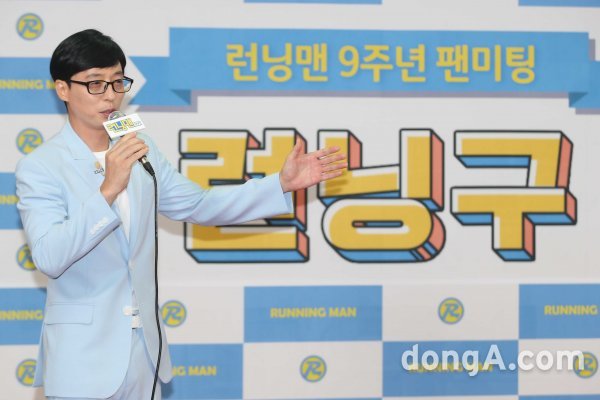 개그맨 유재석이 26일 오후 서울 서대문구 이화여자대학교 대강당에서 열린 SBS 런닝맨 9주년 기념 팬 미팅 ‘런닝구’ 포토월 행사에서 인사말을 하고 있다.