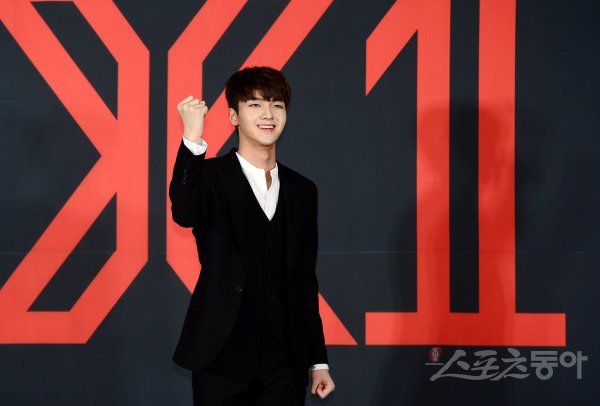 기자회견에 참석한 X1 차준호가 카메라를 향해 포즈를 취하고 있다.