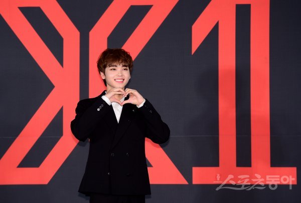 기자회견에 참석한 X1 송형준이 카메라를 향해 포즈를 취하고 있다.