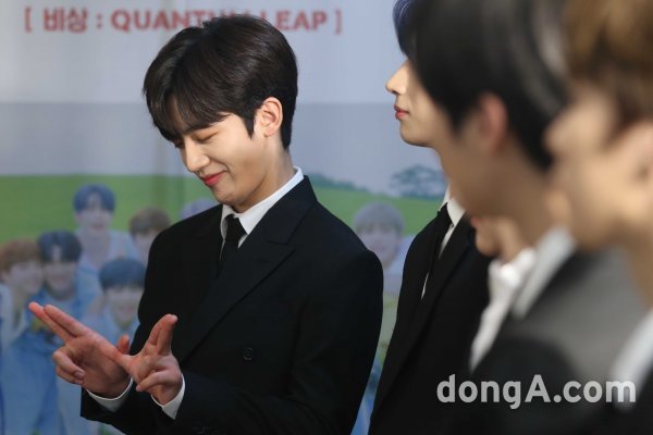 그룹 X1(엑스원)의 김요한이 27일 오후 서울 구로구 고척 스카이돔에서 열린 쇼콘에 앞서 기자간담회에서 동료의 포즈를 따라하고 있다.