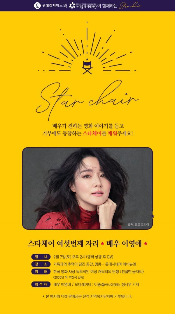 ‘해피앤딩 스타체어-여섯 번째 이영애 편’은 9월 7일 오후 2시 롯데시네마 에비뉴엘에서 진행된다. 이날 상영작은 배우 이영애에게 청룡영화상 여우주연상과 백상예술대상 최우수연기상의 영예를 안겨준 ‘친절한 금자씨’로 선정됐다. 상영이 끝난 뒤에는 관객과의 대화(GV)를 통해 영화 ‘친절한 금자씨’ 촬영 당시의 비하인드 스토리, 이영애가 가족들과 함께 많은 시간을 보냈다는 장소인 명동 인근에 깃든 추억 등에 대해 이야기를 나눌 예정이다.