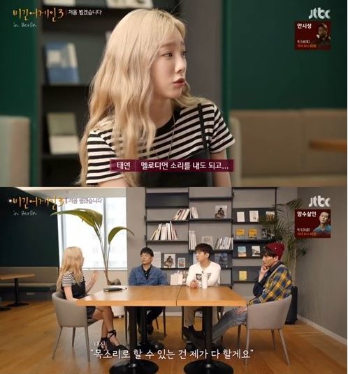 계속해 "무언가 다를 수 있는 악기가 없냐"는 물음에 태연은 "저는 싱어다. 목소리로 낼 수 있는 건 뭐든 다 하겠다"며 포부를 밝혔다.