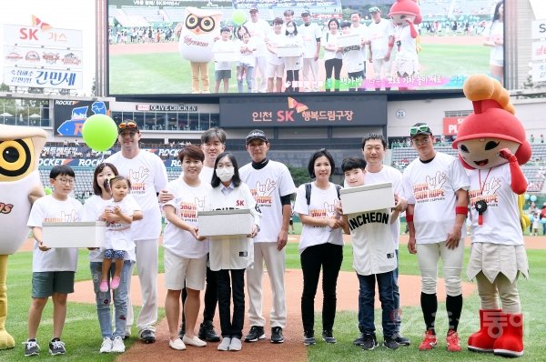 1일 인천 SK행복드림구장에서 ‘2019 신한은행 MY CAR KBO리그’ SK 와이번스와 LG 트윈스의 경기가 열렸다. 경기에 앞서 희귀질환 환우를 돕는 희망더하기 행복드림챌린지 행사에 SK 염경엽 감독, 로맥, 노수광이 기금을 봄, 다은, 성경 환우들에게 전달하고 있다.
