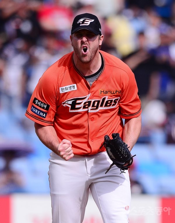 1일 대전 한화생명이글스파크에서 ‘2019 신한은행 MY CAR KBO리그’ kt 위즈와 한화 이글스의 경기가 열렸다. 한화 선발 서폴드가 6회초 2사 1루에서 상대 타자를 삼진으로 처리한 후 포효하고 있다.
