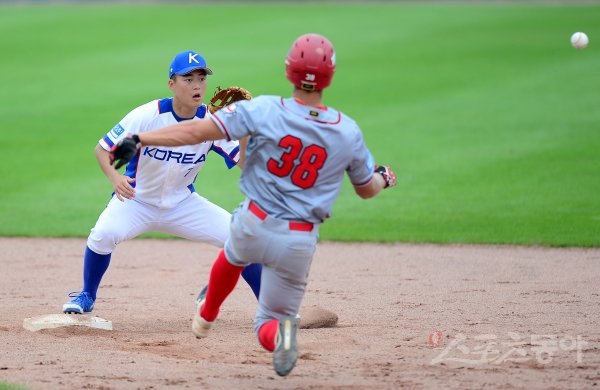 1일 부산 기장군 현대차 드림 볼파크에서 제29회 세계청소년야구선수권대회(U-18) A조 조별리그 한국과 캐나다 경기가 열렸다. 4회초 1사 1,2루 캐나다 내야 땅볼 때 한국 박민이 1루주자를 포스 아웃시키고 있다.