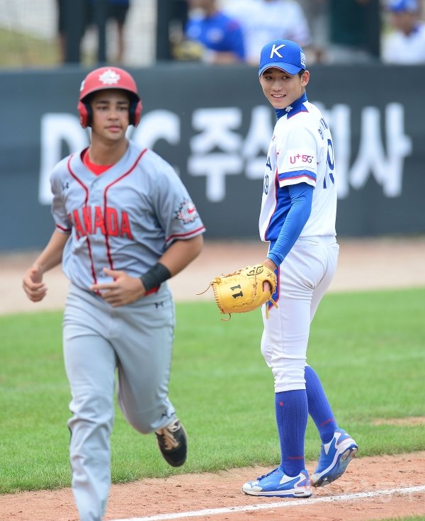 1일 부산 기장군 현대차 드림 볼파크에서 제29회 세계청소년야구선수권대회(U-18) A조 조별리그 한국과 캐나다 경기가 열렸다. 선발 투수로 등판한 이강준이 4회까지 무실점으로 호투한 후 더그아웃으로 향하며 웃고 있다.