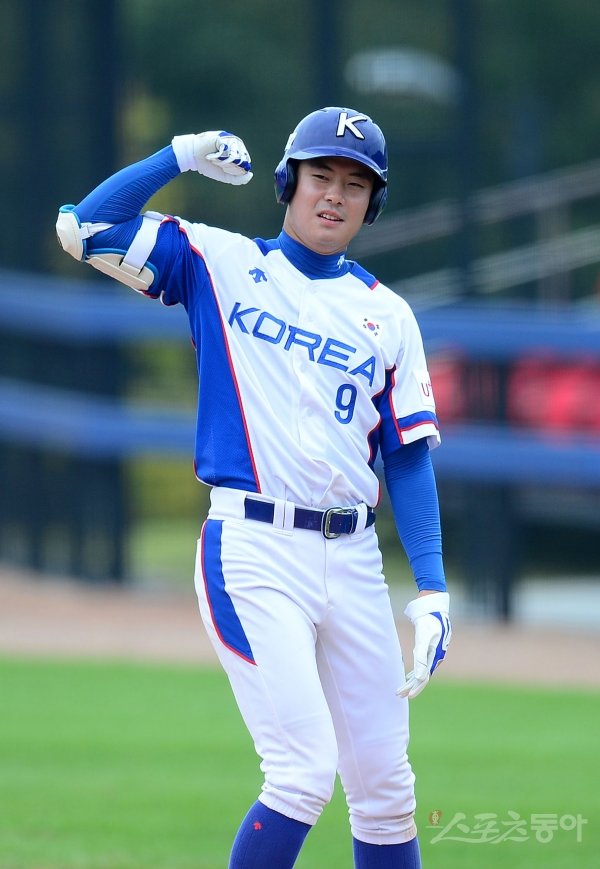 1일 부산 기장군 현대차 드림 볼파크에서 제29회 세계청소년야구선수권대회(U-18) A조 조별리그 한국과 캐나다 경기가 열렸다. 6회말 무사 한국 박시원이 우전 안타를 치고 1루에서 기뻐하고 있다.