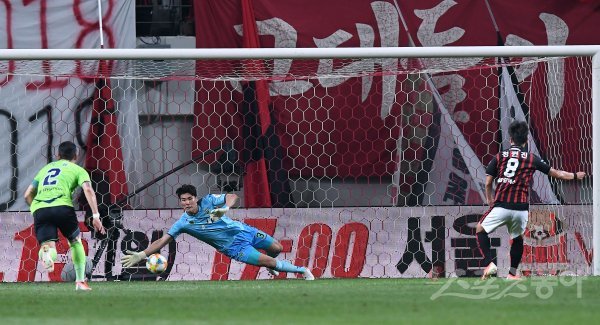 1일 서울 월드컵경기장에서 열린 ‘하나원큐 K리그1 2019’ FC 서울과 전북 현대의 경기에서 전북 송범근이 서울 정원진의 페널티킥을 막아내고 있다.