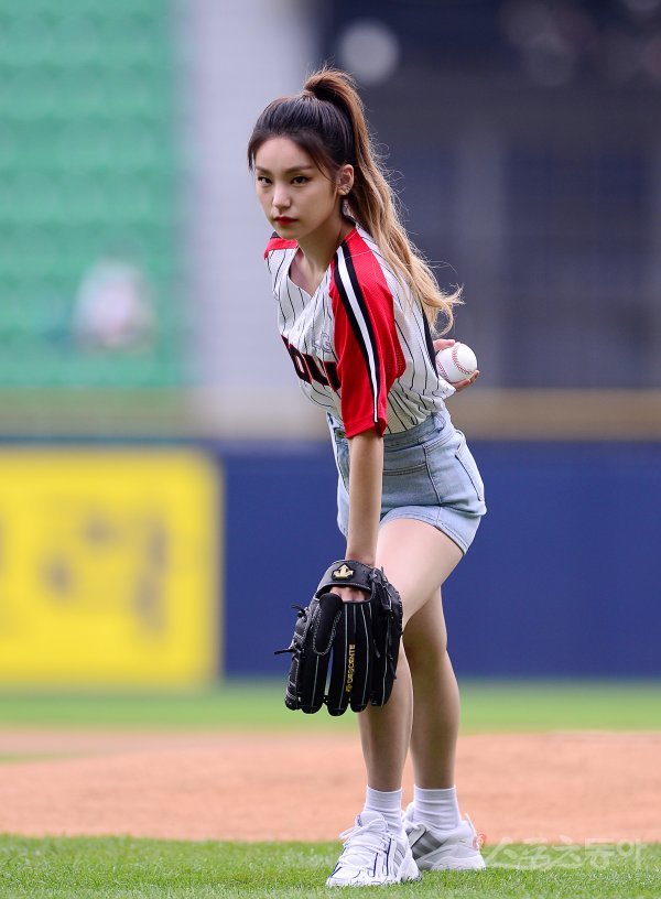 걸그룹 있지(ITZY)의 예지가 8일 서울 잠실야구장에서 열린 ‘2019 신한은행 MY CAR KBO리그’ 두산 베어스와 LG 트윈스의 경기에 앞서 열린 시구행사에서 포수의 사인을 보고 있다. 잠실 | 김진환 기자 kwangshin00@donga.com