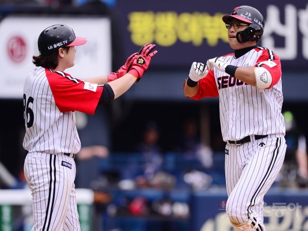 8일 서울 잠실야구장에서 ‘2019 신한은행 MY CAR KBO리그’ 두산 베어스와 LG 트윈스의 경기가 열렸다. LG 채은성이 3회말 1사 1루에서 역전 투런홈런을 친 후 홈에서 이형종(왼쪽)과 하이파이브를 하고 있다. 잠실 | 김진환 기자 kwangshin00@donga.com