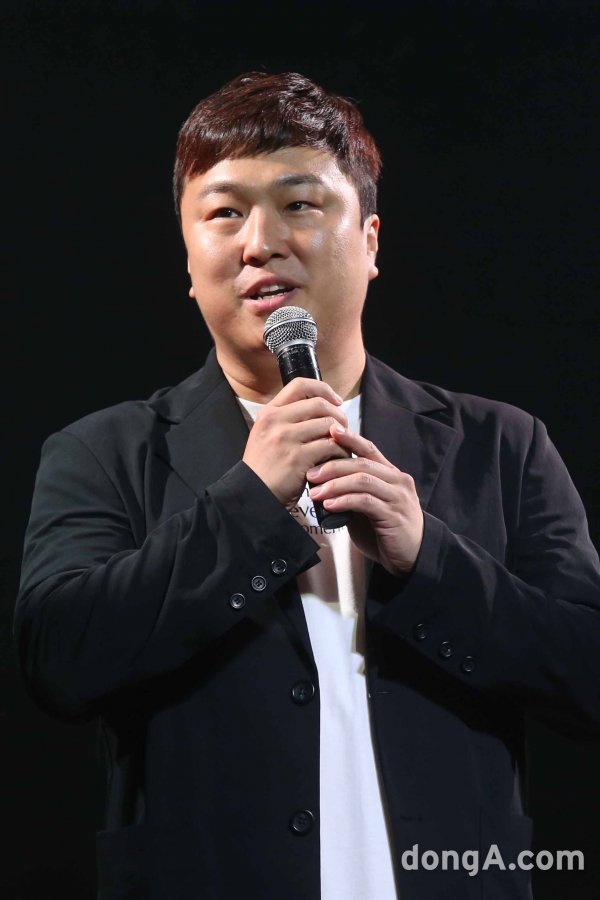 박종욱 작곡가가 9일 오전 서울 마포구 하나투어 브이홀에서 열린 트로트 가수 하유비의 싱글 앨범 \'평생 내 편\' 쇼케이스에서 인사말을 하고 있다.