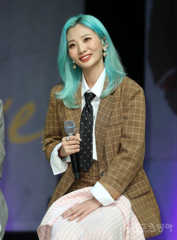 여성 듀오 볼빨간사춘기의 안지영이 10일 서울 강남구 청담동 일지아트홀에서 열린 새 미니앨범 ‘Two Five’ 발매 기념 쇼케이스에서 취재진의 질문을 듣고 있다.