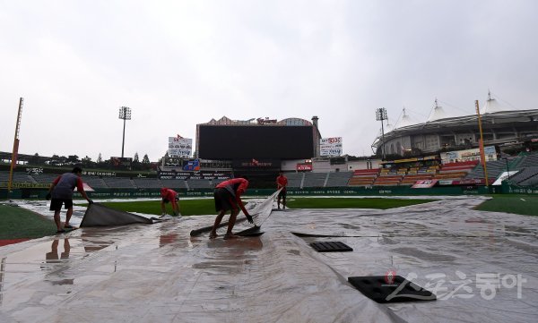 우천 취소 후 SK 관계자들이 그라운드를 정리하고 있다.