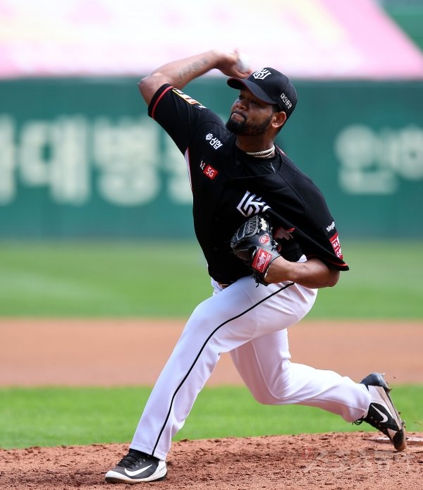 15일 인천 SK행복드림구장에서 ‘2019 신한은행 MY CAR KBO리그’ SK 와이번스와 kt 위즈의 경기가 열렸다. kt 선발투수 알칸타라가 힘차게 볼을 던지고 있다.