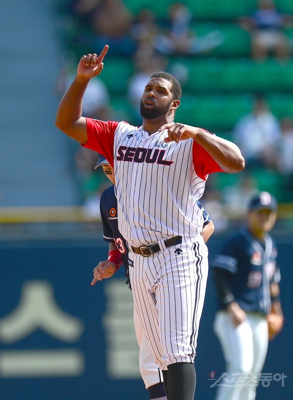 15일 서울잠실야구장에서 ‘2019 신한은행 MY CAR KBO리그’ 두산 베어스와 LG 트윈스 경기가 열렸다. 2회말 1사 LG 페게로가 중전 2루타 를 치고 2루에서 기뻐하고 있다.