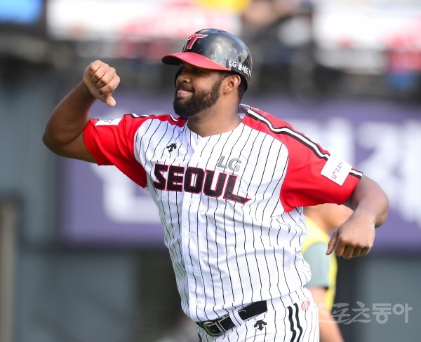 15일 서울잠실야구장에서 ‘2019 신한은행 MY CAR KBO리그’ 두산 베어스와 LG 트윈스 경기가 열렸다. 4회말 2사 1루 LG 페게로가 우중월 솔로 홈런을 날린 후 그라운드를 돌아 홈인해 하이파이브 하고 있다.