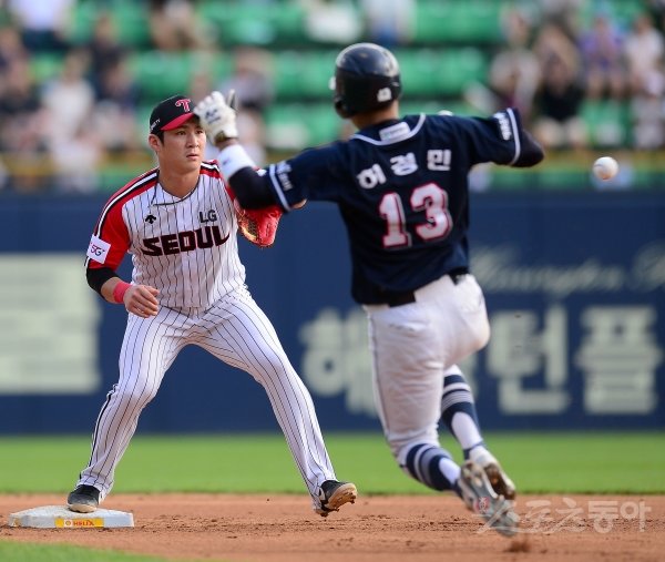 15일 서울잠실야구장에서 ‘2019 신한은행 MY CAR KBO리그’ 두산 베어스와 LG 트윈스 경기가 열렸다. 5회초 1사 1,3루 두산 내야 땅볼 때 LG 오지환이 1루주자를 포스 아웃시키고 있다.