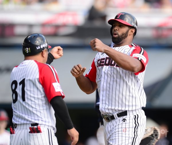 15일 서울잠실야구장에서 ‘2019 신한은행 MY CAR KBO리그’ 두산 베어스와 LG 트윈스 경기가 열렸다. 4회말 2사 1루 LG 페게로가 우중월 솔로 홈런을 날린 후 그라운드를 돌아 홈인해 하이파이브 하고 있다.