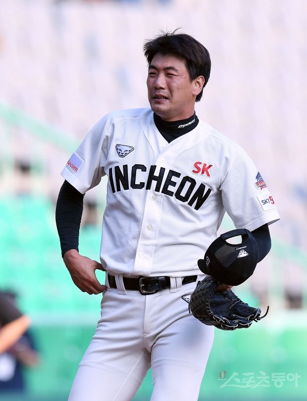 15일 인천 SK행복드림구장에서 ‘2019 신한은행 MY CAR KBO리그’ SK 와이번스와 kt 위즈의 경기가 열렸다. 9회초 2사에서 SK 김광현이 구원 등판해 kt 황재균에게 솔로 홈런을 허용한 뒤 아쉬워하고 있다.