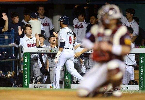 16일 서울잠실야구장에서 ‘2019 신한은행 MY CAR KBO리그’ 키움 히어로즈와 두산 베어스 경기가 열렸다. 4회말 2사 3루 두산 김인태 적시타 때 득점한 페르난데스가 더그아웃에서 하이파이브 하고 있다.