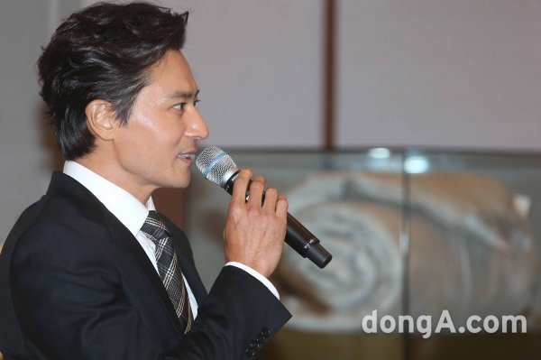 배우 장동건이 21일 오후 서울 중구 신라호텔에서 열린 한 침구 브랜드 행사에서 인사말을 하고 있다.