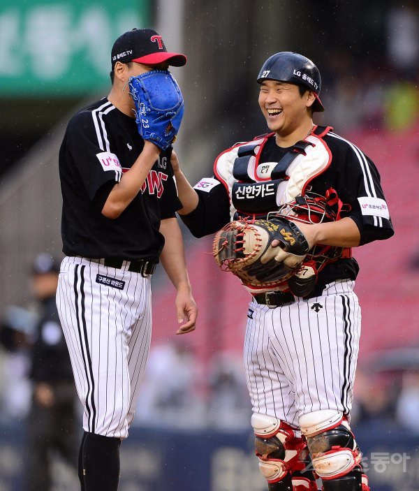 LG 포수 유강남이 8회말 2사 2루에서 교체를 앞둔 선발 차우찬(왼쪽)과 환하게 웃으며 대화를 나누고 있다.