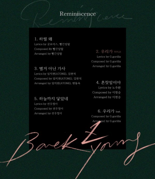 가수 백지영이 새 미니앨범 ‘Reminiscence(레미니센스)’ 트랙리스트를 공개했다.