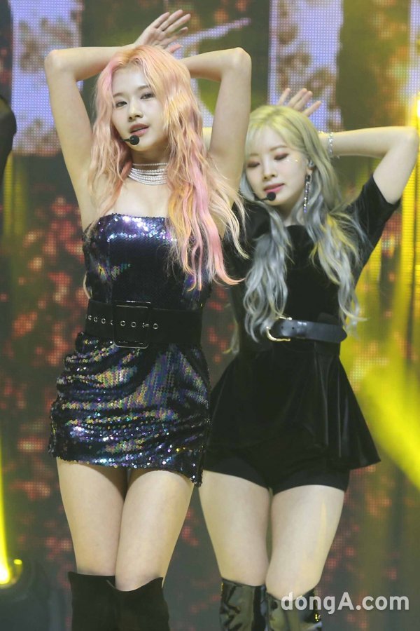 그룹 트와이스의 사나(왼쪽)와 다현이 23일 오후 서울 광진구 예스24라이브홀에서 열린 미니 8집 앨범 \'필 스페셜\' 발매 쇼케이스에서 새로운 무대를 선보이고 있다.