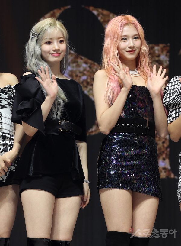 걸그룹 트와이스의 다현과 사나(오른쪽)가 23일 서울 광진구 Yes24 라이브홀에서 열린 미니 8집 ‘Feel Special’ 발매 기념 쇼케이스에서 포토타임을 갖고 있다.