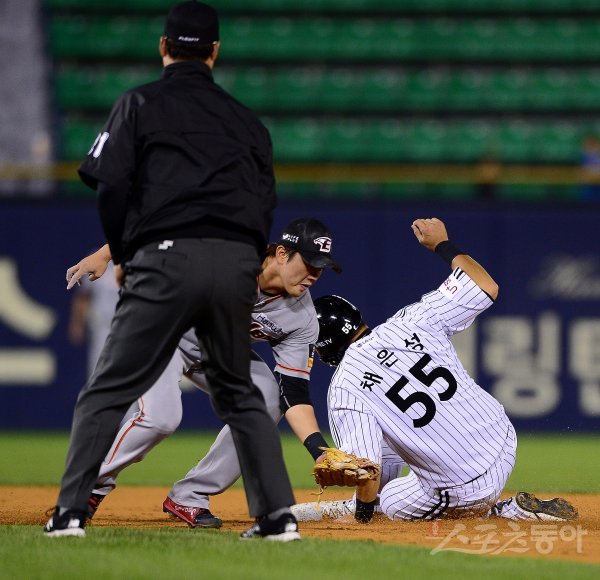 LG 채은성이 2회말 2사 1루에서 2루 도루를 시도해 성공하고 있다.