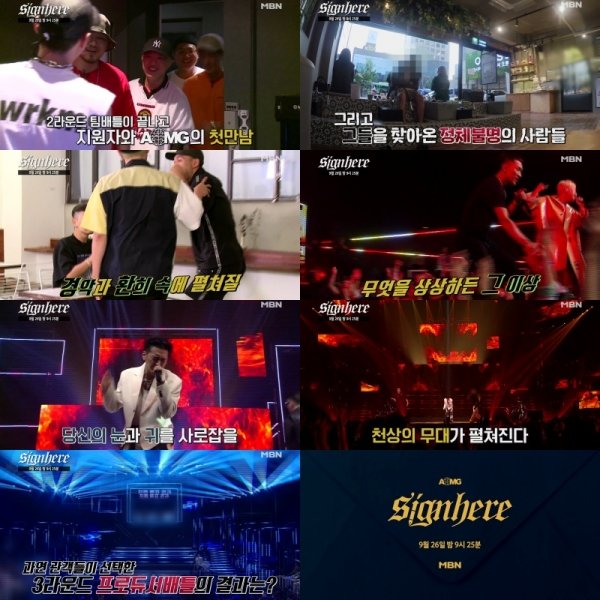 9월 26일 방송될 MBN ‘사인히어’ 5회에서는 2라운드 2대2 팀 배틀을 통과한 참가자들이 AOMG 심사위원 5인과 더불어 팀을 구성하고, ‘프로듀서 배틀’을 본격적으로 펼친다.