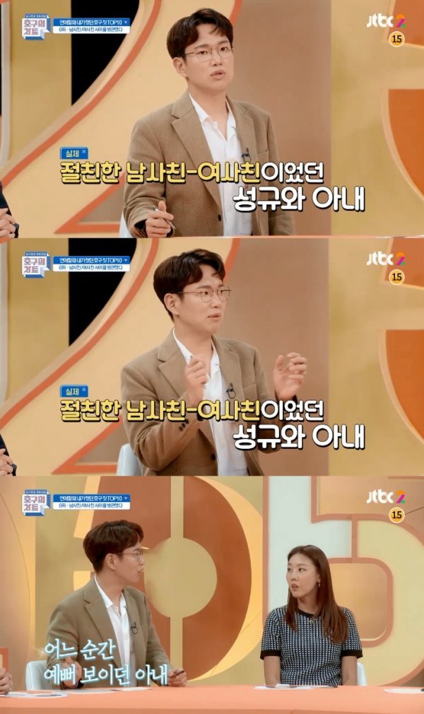장성규는 “원래 아내와 절친한 ‘남사친’(남자 사람 친구 줄임말) ‘여사친’이었다. 그런데 어느 순간 아내가 예뻐 보였다”고 말했다.