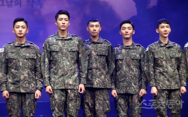 김민석과 이성열, 김성규, 윤지성, 조권(왼쪽부터)이 24일 서울 용산구 한남동 블루스퀘어 아이마켓홀에서 열린 2019 육군 창작 뮤지컬 ‘귀환’ 프레스콜에서 포토타임을 갖고 있다.