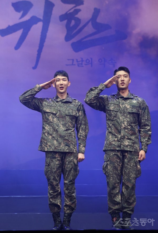 조권과 고은성(오른쪽)이 24일 서울 용산구 한남동 블루스퀘어 아이마켓홀에서 열린 2019 육군 창작 뮤지컬 ‘귀환’ 프레스콜에서 포토타임을 갖고 있다.