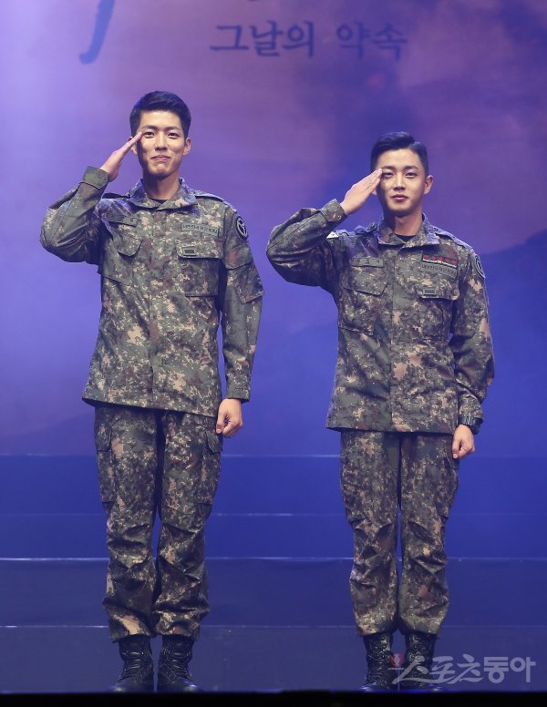 이성열과 김민석(오른쪽)이 24일 서울 용산구 한남동 블루스퀘어 아이마켓홀에서 열린 2019 육군 창작 뮤지컬 ‘귀환’ 프레스콜에서 포토타임을 갖고 있다.